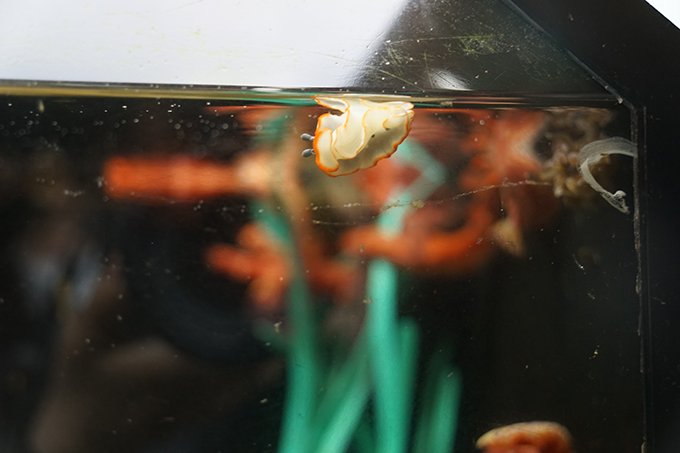 展示生物は教職員が調査で採取したもののほか、地元の漁業協同組合からの提供を受けた生物ばかり。どれも白浜周辺に生息する生物だ。白浜周辺は、岩盤、砂場、泥など、水底の地形が複雑。それぞれの環境に適応した多様な温帯性の生物が生息する。さらに、温かい黒潮が流れ込むので、南方系の生物が運ばれてくることも多い。生物多様性に富んだ環境が展示の多様性を支えている。