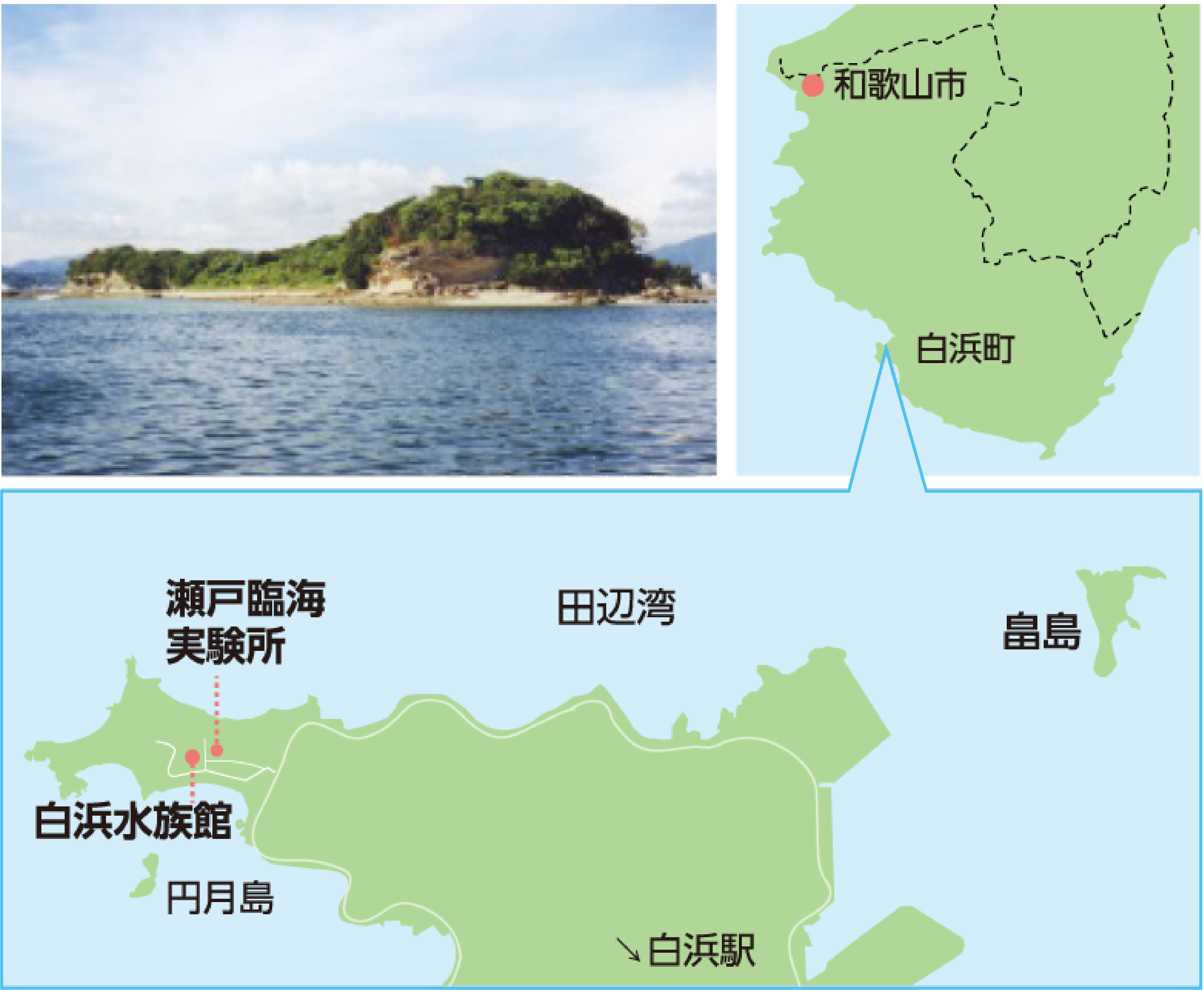 瀬戸臨海実験所が管理する無人島。人が手を入れる前の海岸が保存されている。この島では、年に一度、生物多様性と環境・気候の変遷を調査。1960年から2060年までの100年間、同じ方法でデータを集める計画で、2019年に50年間のデータをまとめて発表した。