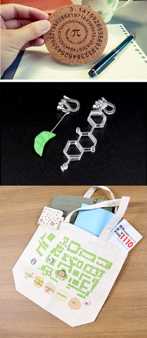 上から順に、円周率コースター、イソフラボンイヤリング、 京大トート。イベントでの販売の他、一部の商品は時計台生協ショップや京都大学総合博物館でも販売している