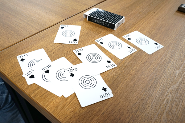 円周率コースターに次ぐ人気商品になりつつある「二進数トランプ」。引いたトランプの数字の積を素早く答えるゲームなど、独自の遊び方を記した説明書が付属