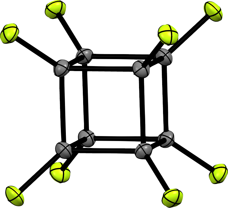 秋山助教が目をつけたのは、キュバンと呼ばれる分子(図2)。立方体構造の8つの頂点全てに原子が結合したものだ。1964年の合成の成功以降、頂点にどのような原子を結合させるのか、そうして出来た分子はどんな性質をもつのか、世界各国の化学者が議論と検討を重ねてきた。「研究のタネを探そうと論文を眺めていると、2008年に発表された論文に、キュバンの頂点の全てにフッ素原子を結合する『全フッ素化キュバン』の記述を見つけました。これが実現すれば、立方体の内部空間に電子を閉じ込められると予測されていたのです。機能のおもしろさもさることながら、なにより惹かれたのは分子の見た目。理屈を超えたワクワクを感じました」。