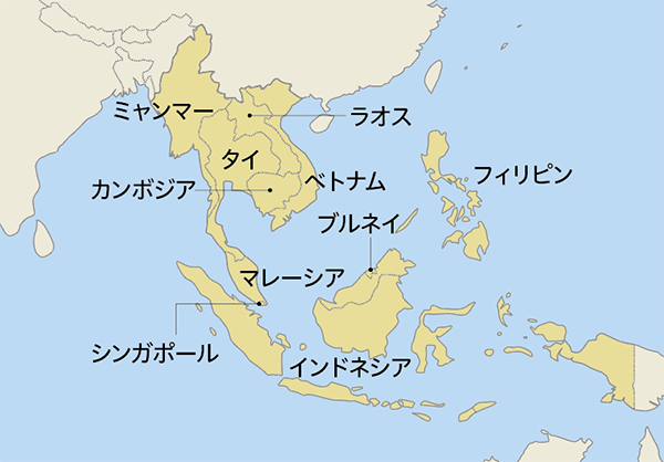 地域の平和と安定に取り組むことを目的に1967年に設立されたASEAN。設立当時の加盟国はタイ、インドネシア、シンガポール、フィリピン、マレーシアの5か国。その後、ブルネイ、ベトナム、ラオス、ミャンマー、カンボジアが順次加盟し、現在は10か国で構成される。2015年には、加盟国を一つの経済圏とみなし、物品やサービス、投資などの自由化を図る経済共同体の枠組みを発足。