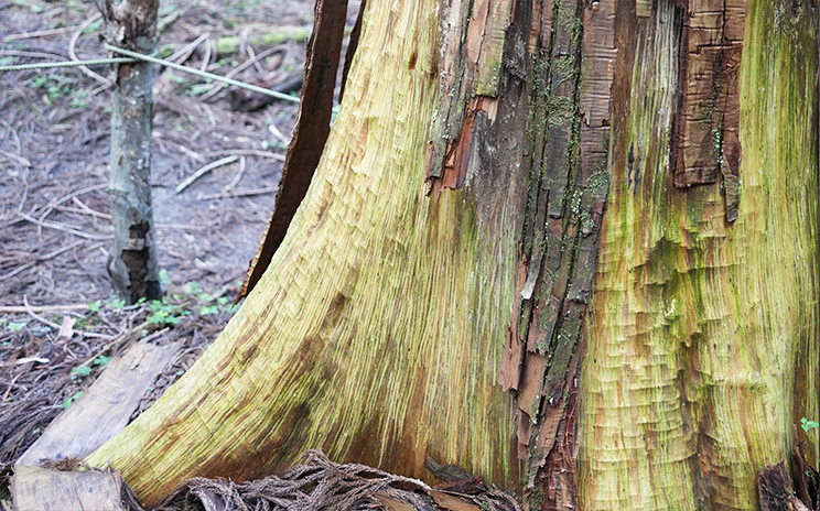 林内の木にはクマハギの痕があるものも