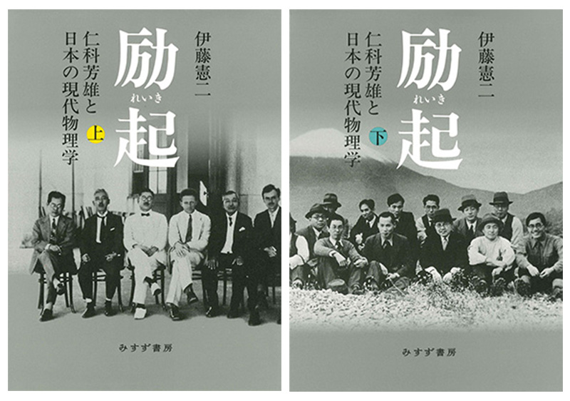 2023年に上梓した『励起 仁科芳雄と日本の現代物理学』(みすず書房)。上巻は1929年に仁科の招へいでハイゼンベルクとディラックが来日したときの写真。下巻は1936年に研究室のメンバーとハイキングしたときのもの。