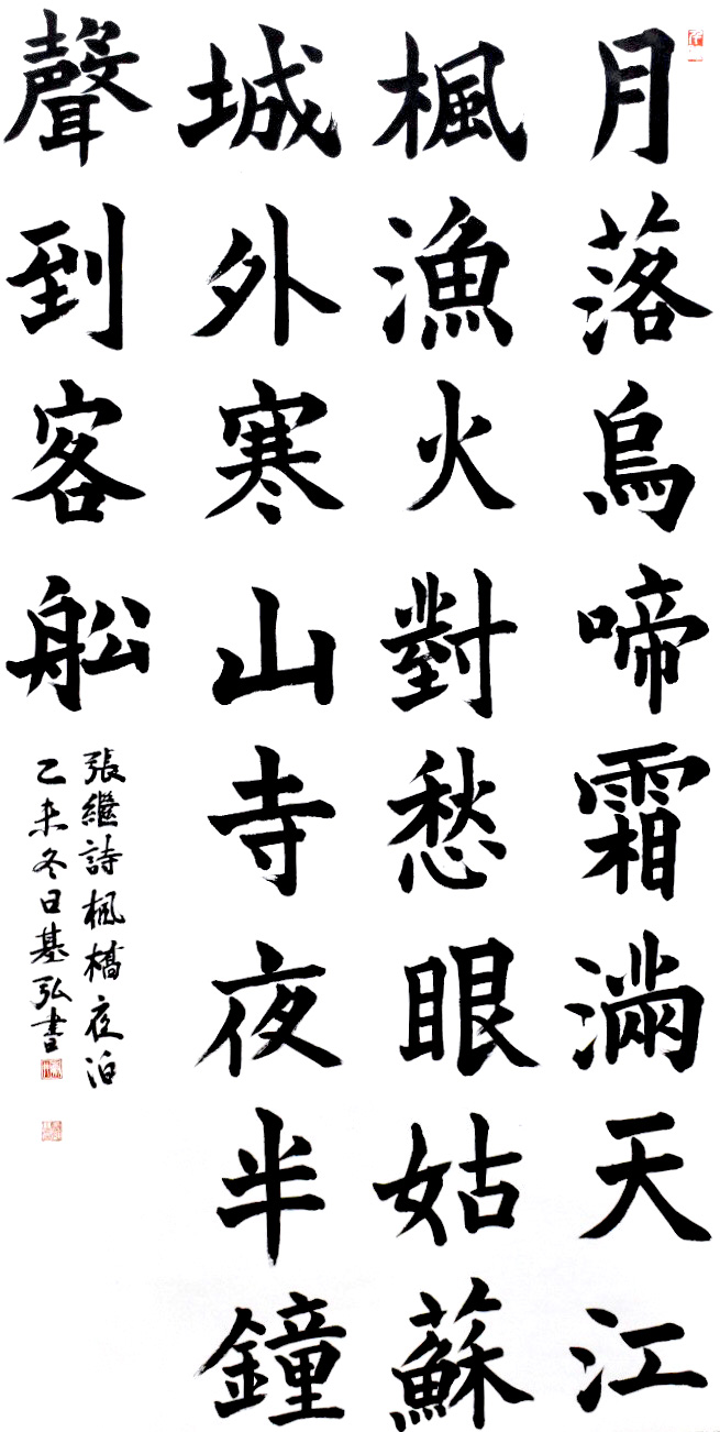 私は、この作品を京大書道部の2015年の冬樟展(於・建仁寺)に出品しました。1994年夏に、ミネソタ州のミネアポリスのコンコルディア言語村に日本語を教えに行きました。夕食後約一時間、大食堂で約120人の小学生から高校生のアメリカ人に書道を教えました。これがキッカケで私は書道にのめり込みました。その時、他人に教える以上或る程度自分自身に「書道」に関する知識・経験が必要と思いました。丁度、職場からの帰路の途中に「書」の個展を開いている方があり、事情をお話しその方の教室に通うことになりました。その後、2000年夏に蘇州に三週間「書」の勉強に行きました。その時に「寒山寺」を訪れたのです。