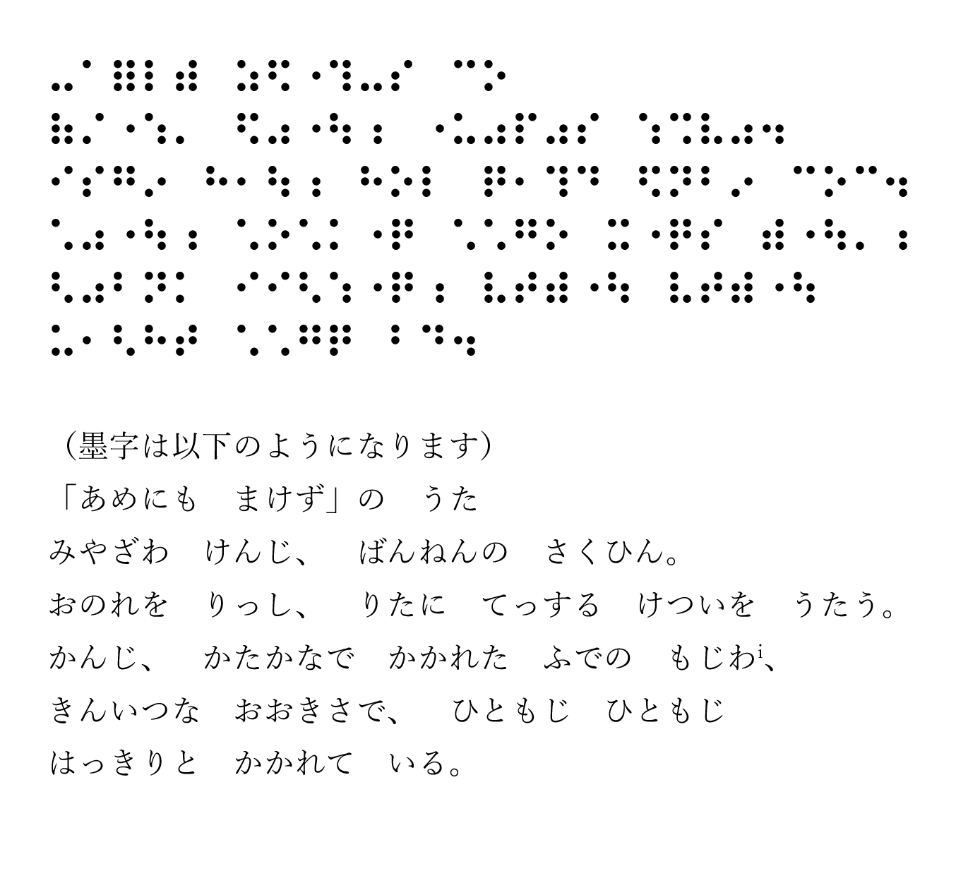 書は、意味内容と筆跡が互いに影響しているように思います。ただ、その関係についての個人的な解釈は点字で伝えることではない気がして、視覚に訴えてくる情報を、できるだけ簡潔に表現するよう努めました。