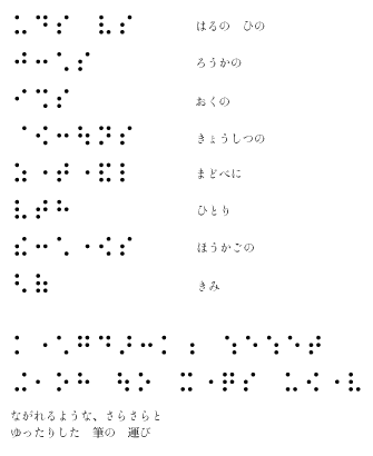 書はそのかすれ具合、字の繋がりなどから、見る人の想像力をかきたててくれます。一方、点字は単調な文字の並びです。書かれている内容だけでなく、その書きぶりも点訳する、そうすることで(「おと」と相まって)「いろ」の印象を少しでも伝えられたら幸いです。