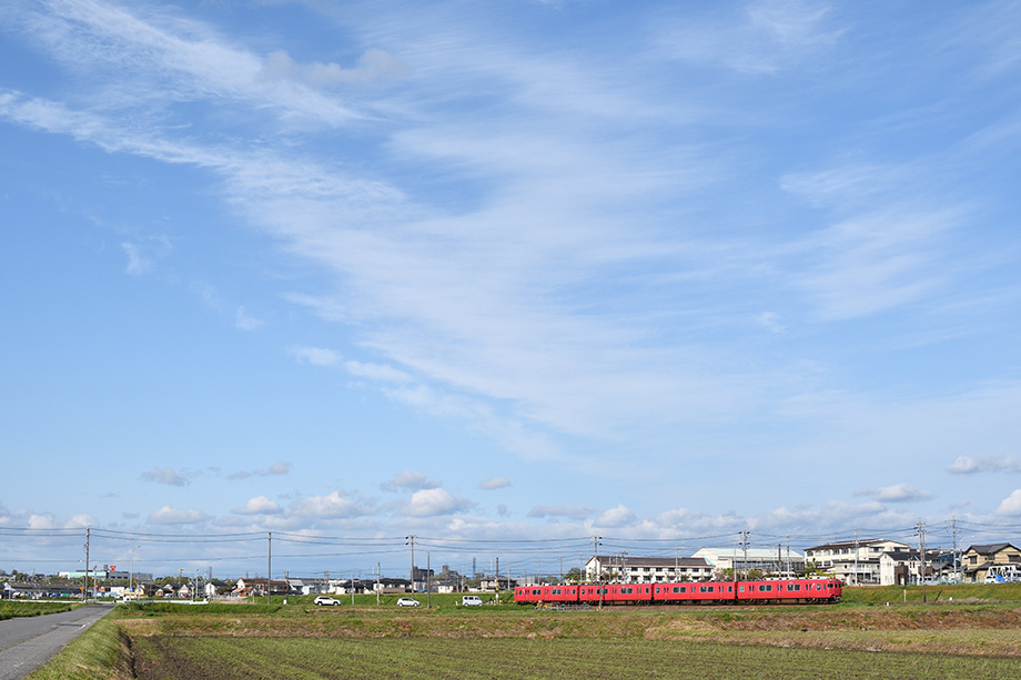 こだわりの点:春の晴天のもとを走り抜ける名鉄電車。スカーレットの車体は、遠くからでもその姿を認識できるくらいの存在感を放っている。