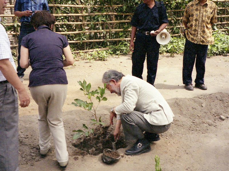 ブカランガン計画で、そのワントさんと濱元さんたちが協力して建設し、村の子供たちに防災の知識を伝える「防災情報拠点」を見学する。そこでも植樹した。こんどはドリアンの木を選んで植えた。