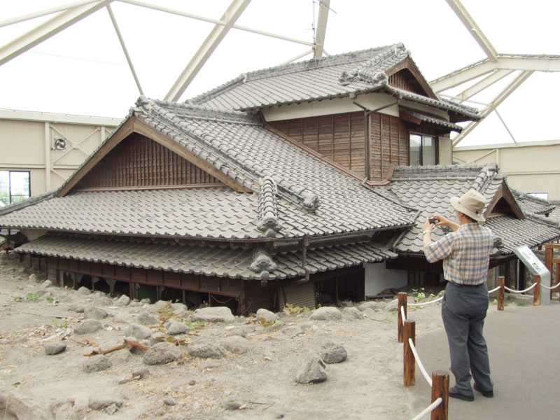 まゆやまロードを登って、平成新山を間近に見たあと、土石流被災家屋保存公園で埋もれた家を見た。2002(平成14)年8月8日〜14日の間に被害にあった実際の建物11棟が保存されていて、家屋の1階がほぼ埋もれている。平均で約2.8メートル埋没しているという。