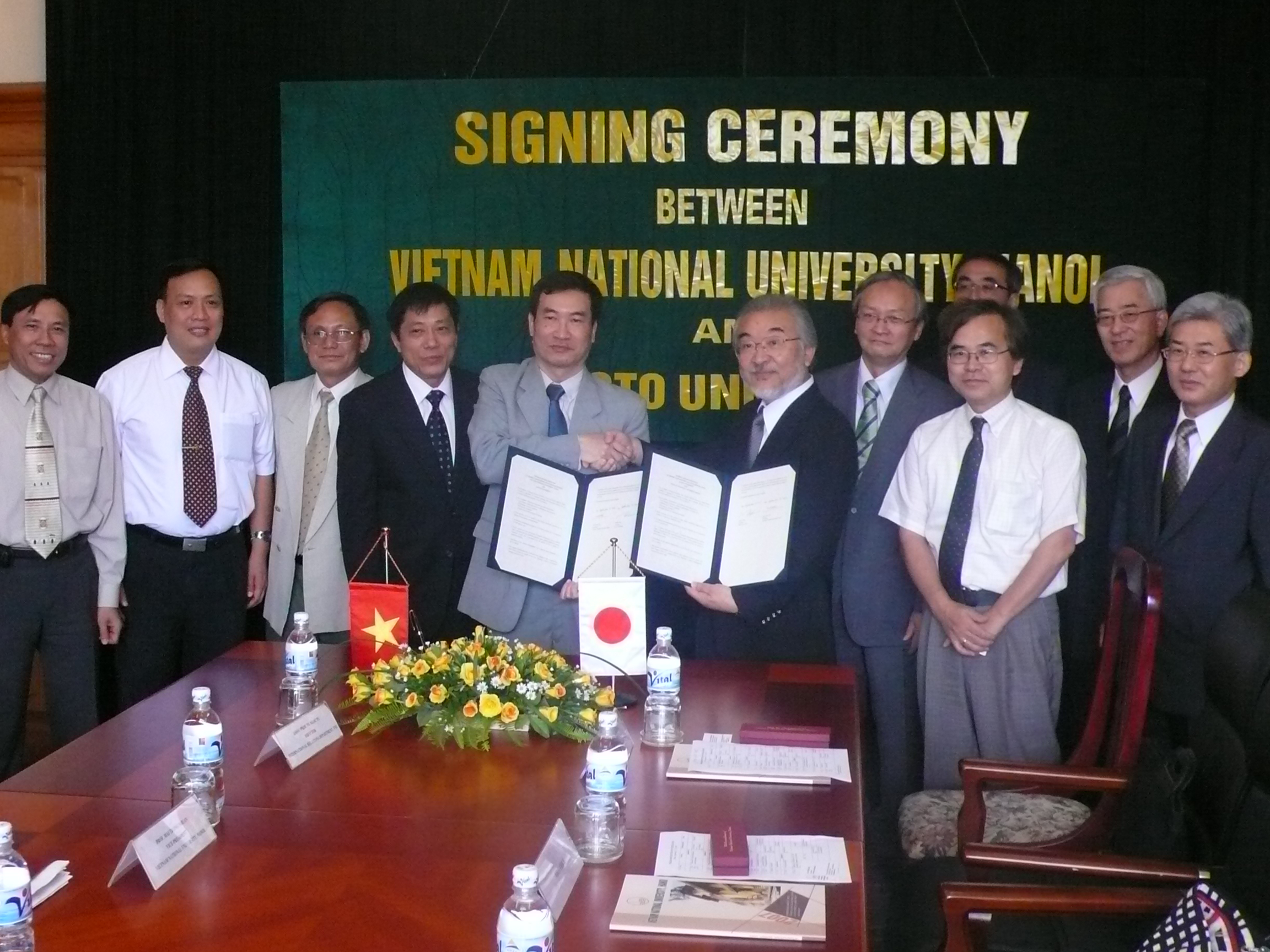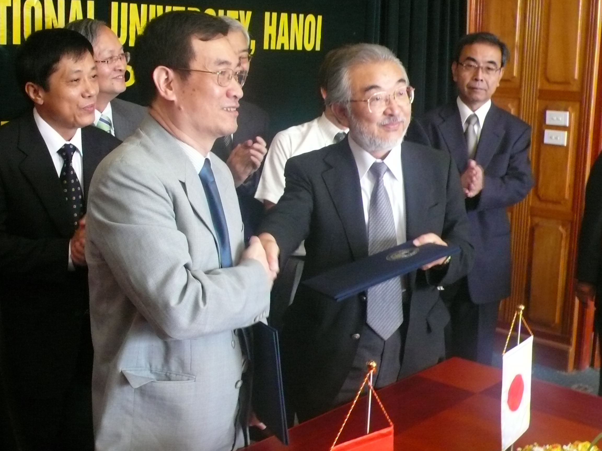 西村理事、松本理事、嘉門さん、江崎さん、小林さんたちも立ち会って、フエ大学との大学間交流協定に、Nguyen Van Toan学長とともにサインした。