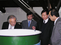 黄桜株式会社の本社で、代表取締役社長 松本真治さんと専務取締役 若井芳則さんのご案内をいただいて、まず三栖工場の見学である。玄米を運び込んで、精米、浸漬、蒸米から始まる清酒を造る一連の行程を見学した。パンフレットの説明は、豊かなわき水と京の底冷えが酒どころ伏見をつくったということから始まる。そして、山田錦を超高度精米で大吟醸に造り上げる現場を見学する。工場の中を行程に沿って行くと、空気が糠くさい米の臭いから、芳醇な酒の香りに変化する。