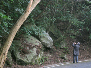 2008年2月28日、鹿児島経由の空路で島に着いた。鹿児島空港では霧島の山々が目の前にくっきりと見えた。プロペラ機で屋久島に着くと、屋久島観察ステーションで仕事をしている杉浦さんが迎えてくれた。レンタカーを伊谷さんが運転して、いよいよ屋久島の旅が始まる。円形の島の周囲は約100キロ。今回の二泊三日の滞在では山地に入っていく時間はない。上から見て反時計回りに島の海岸に沿って廻る。