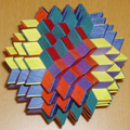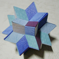 今回は、菱形星状体(60面体)の設計図を用意しました。実は、菱形三十面体の設計図を2つ分、隙間をつめて並べただけなので、昨年7月に紹介した菱形三十面体の設計図を2つ使っても同じです。ただし、折り方には注意してください。