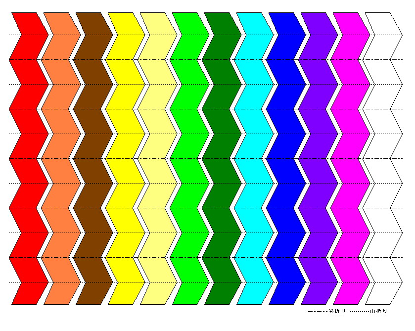 切れたら、両端が山折りになるように注意して、山折り、谷折りを交互に繰り返します。ここで、両端を谷折りにしてもできなくはないのですが、組しろの処理が難しくなるのでおすすめできません。準備は以上です。