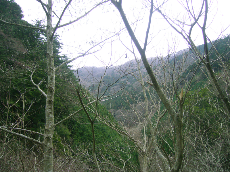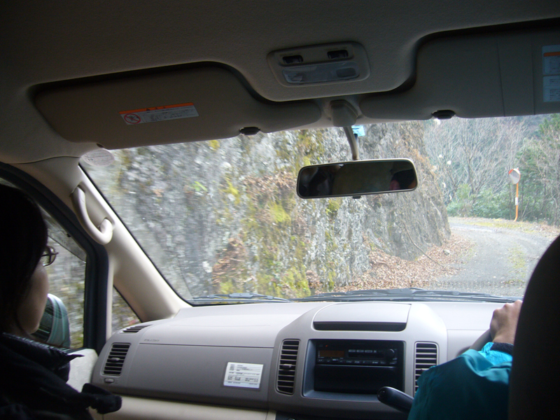 ホタル王国という看板もある。川原には荻と見られる植物の群が枯れている。10時40分、一段と狭い道になる。所々に塩化カルシウムの袋が置いてある。岩肌むき出しのトンネルがあって、10時55分、護摩壇山へ行く道と分かれて、京都大学の看板のあるがたがたの地道に入った。11時5分に研究林の事務所に着いた。