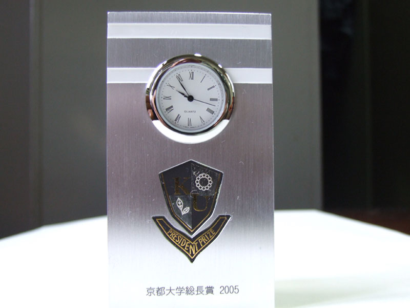 京都大学書道部の筆による表彰状と、京都の学生グループ「りんず」にこの賞専用に制作してもらった京都象嵌の時計を贈りました。