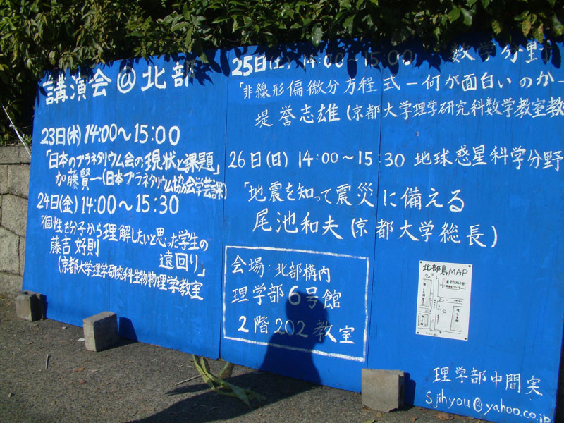 ●2006年11月22日(水曜日)から26日(日曜日)にかけて、第48回京都大学11月祭が開催されました。22日は前夜祭です。教員酒場も盛況だったそうです。統一テーマは「溢れる才能の無駄使い」でした。私も教育学部のカフェや、軽音楽の会場。落語研究会など、楽しく会場を廻りました。
