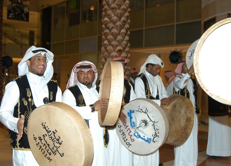 夕方、17時40分にホテルを出発した。近くのScitech館へ、またパトカー先導の一列が走る。大きな部屋に集まって、挨拶をして、アラビアコーヒーを飲み、お菓子を摘んでしばらくおしゃべりをする。突然太鼓の音が聞こえる。ホールでダンスが始まった。一群の男たちが太鼓を叩き、もう一群の男たちが剣を上下に振る。それに参加して私も剣を持たせてもらった。