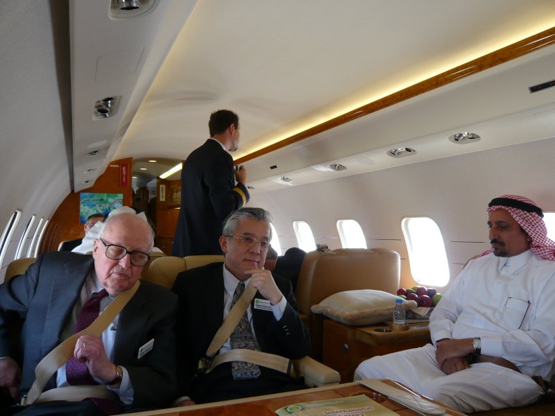 議論を議長がまとめて、副議長を決め、次の会議の予定を決めたのち、バスに乗って11時20分に出発し、またパトカーの先導で、ダンマンの空港に向かう。空港では簡単なセキュリティーチェックを受けて直接滑走路側に出る。小型機が待っていて乗り込むと、応接セットがゆったりとある快適な部屋である。