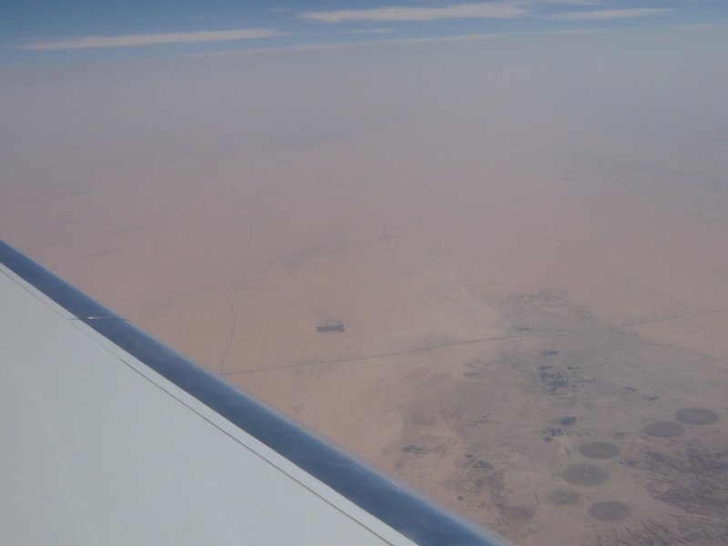 一面に砂ぼこりのようにかすんだ上の青空に、月齢20位の月がくっきりと浮かんでいる。海にはところどころ、丸い形に砂州ができている。船も見えるが浅瀬を避けて航行しているのであろう。飛行機が着陸態勢になると、左下に一面の砂漠の景色が見えてきた。私にとっては初めてのアラビア半島である。海はエメラルド色で、風のない小ジワの海面を見せている。