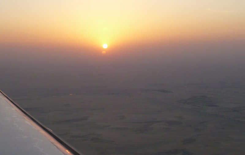 また、車でリヤド空港へ向かい、しばし待合室でアラビアコーヒーを味わい、同じ小型機に乗って飛び立った。飛行機がダンマンの空港に着陸するのと、真っ赤な太陽が、砂漠の端に隠れるのとが、まったく同じ時刻となった。こんな経験はまたとないかもしれないと思いながら、シャッターを押した。