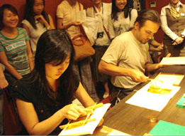 第一天,从京都大学出发后,大家乘巴士一起去岐阜县高山市参观了“高山节之森林”,随后又在古城街道附近散步,并学习了那里的传统工艺和古城的历史,最后入住了高山市内的一家宾馆。第二天参观了“宫川早市”之后,接下来又访问了世界遗产之一的“白川乡”,并在具有陡峭屋顶特征的房子一带散步,还进入到重要文化财产之一的“和田家”中参观了他们的生活用具以及建筑物的内部结构,并了解了各种各样的生活小窍门。接下来访问了金泽市内“长町武士住宅地区”,之后又在“箔一”总店进行了移动金箔的体验学习。面对着把只有万分之一毫米厚的金箔切成四角形并移动到纸夹子上这种精细的作业,大家都摒住呼吸认真专心的做了起来。在指导员的帮助以及大家相互的鼓励下,每一个人都完成得很好。当天晚上大家在日本的旅馆穿上了日本传统的浴衣并体验了日式温泉,相互进行了欢快的交流。最后一天,在饱享了东寻坊的绝境之后,又参观了位于福井县的曹洞宗总院的永平寺,最后大家顺利返回了京都大学。