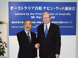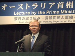 讲演会当日,凯文 鲁迪(Kevin Rudd)首相首先与尾池和夫校长进行了亲切的握手。随后,在稻盛大厅举行了题为「豪日の取り組み-気候変動と軍縮/不拡散、地球規模の課題に向かって-」 (Australia and Japan Working Together on the Global Challenges of Climates Change and Disarmament)的演讲,410名参加者认真地进行了听讲。