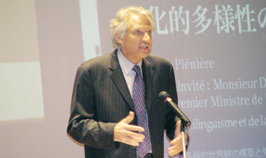 会议第一部分以「挑战多样化世界中的多语言主义及多元化文化」为题,由法国前首相Mr. Dominique de Villepin)主讲。第二部分由人与环境研究科佐伯啓思教授发表「混乱中的世界由美国单一主义至多样化世界」, 中央大学三浦信孝教授发表「日本国策的多语言主义」。之后,在人与环境研究科小仓纪准教授的主持下,三人针对英语外的外语学习意义的再认知及多样化世界观建立的重要性彼此交换了宝贵的意见 。