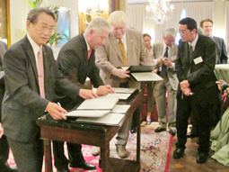 本次会议响应德国方面的号召,由海德堡大学、哥廷根大学、卡尔斯鲁厄理工学院、日本方面则由我校、大阪大学、东北大学等6所大学校长和研究人员以及日本学术振兴会参加,除由110名全体成员参加的全体会议和由6位校长针对学术交流方案构建新框架的研讨会议之外,同时还举办了“Life Science meet Natural Science: Crossing Borders”等7个专门会议,讨论了扩大两国各研究范围的交流活动及其课题等。最后,在驻德日本大使神余隆博先生列席下,一致通过了6大学校长共同宣言。6所大学通力合作,确定将本次会议作为以促进两国科学知识进步为目标的学术交流活动的开端,各大学校长均在共同宣言书上签字。
