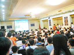 在举行学术交流会的同时,国际交流中心韩立友助教以中国科学技术大学的本科学生为主要对象,用汉语介绍了到京都大学留学的事项。说明会现场爆满,与会者超过150名,部分学生甚至在场外聆听。