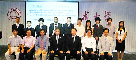 为在中国科学技术大学(以下简称“USTC”)举行学术交流、学生交流、并面向普通学生召开京都大学留学说明会,在京都大学研究与国际负责人、理事兼副校长吉川洁的率领下,能源科学研究科兼GCOE负责人八尾健教授、石原庆一教授、能源理工学研究所大垣英明教授、国际交流中心韩立友助教及5名能源科学研究科与工学研究科的在读博士生组成的代表团一行人于9月9日~10日对USTC进行了为期2天的访问。