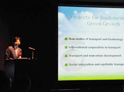 由低碳城市圈政策研究小组负责人谷口荣一教授致开幕词并就本研讨会宗旨进行介绍后,韩国交通研究院•绿色发展实践研究本部长Jaehak OH以“韩国绿色发展的交通战略-政策与技术的融合”为题,就韩国的新交通战略进行了演讲。首尔已引进Bus Rapid Transit(BRT),拆除城市高速公路后在清溪川正在进行水边再生工作,对于今后城市的进一步发展与环境的协调的相关构想也做了介绍。同时,对于立体交通的必要性、自行车专用高速公路的修建、通过重新分配道路空间创建绿色步行者空间创建,车站周边设施的修建等目前正在计划中的项目也做了介绍。