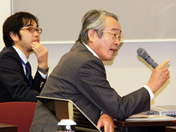 担任本次学习会策划及主持工作的山田组长(左)和正在提问的富田教授(右) |