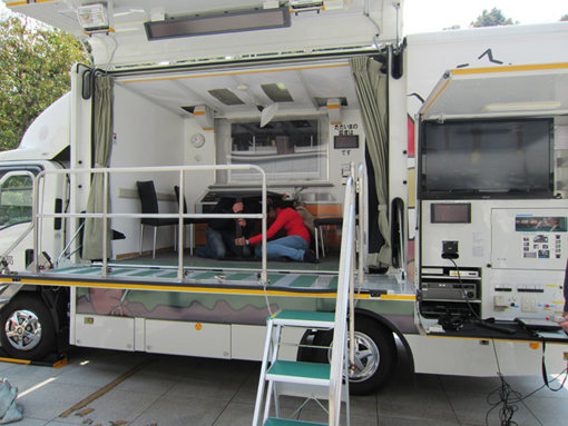 参加讲座的33名留学生认证聆听关于灾害时如何应对等的讲解,积极参加地震模拟车的地震体验。