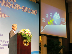 研讨会的后半部分由8所大学的校长作了主题为“培养国际化人才的全球性战略”的演讲,约有260名人士参加。松本校长在演讲中指出,我们需要培养能够解决全世界共同面临的资源问题、环境问题、感染性疾病等复合型课题的国际化领导人才;国际化人才需具备的素质包括预见未来的能力、坚定的世界观、哲学及志向、广阔的视野、能够在国际社会发声的外语能力、以及作为日本人或中国人的自我认识;培养国际化人才就是“育人”;并介绍了我校旨在培养国际化人才的博士课程教育领导课程京都大学研究生院“思修馆”。