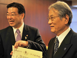 京都府向荣获诺贝尔生理学或医学奖的iPS细胞研究所所长山中伸弥教授颁发了京都府特别荣誉奖,向京都大学赠送了感谢状。松本纮校长和山中所长从京都府知事山田启二手中接过了感谢状和奖状。