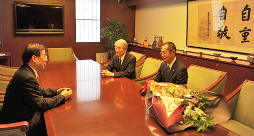 左起山田知事、山中所长、松本校长 |