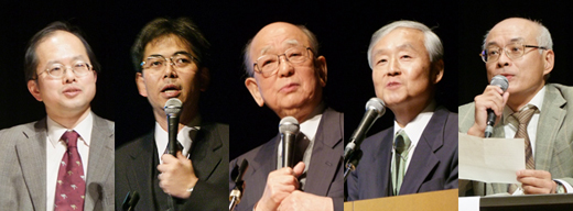 左起:进行演讲的病毒研究所景山龙一郎教授、基础物理学研究所田中贵浩教授、北海道大学铃木名誉教授、核反应堆研究所小野公二教授、灵长类研究所高井正成教授 |