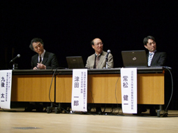 最后,以“科学揭示的日本之去路”为题,由基础物理学研究所的九后太一所长为协调员,邀请北海道大学数学合作研究中心的津田一郎负责人和读卖新闻大阪总社编辑局科学部的常松健一部长为特邀嘉宾,在之前进行演讲的本校附置研究所与研究中心的4名教员回答会场事先选出的提问后,开始了公开讨论会,大家就学习科学的重要性、支持社会的基础研究的重要性及作用进行了讨论。