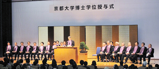 各位同学这几年所就读的研究生院是非常严格的治学之地。在读期间,可能同学们经历过挫折,面对过苦恼,但最终大家克服重重困难,在研究生院潜心学习专业知识,在自己的专业领域获得了自强自立之能力。而这一切,将在今天京都大学博士学位授予仪式上获得肯定。从今天开始,你们要以不畏惧任何人的自信和超越先人的气概,发挥历经磨练而铸就的个性,运用自己掌握的专业知识,肩负起挽救日本于危难中、复兴和重建日本的使命。我坚信,所谓学问是建立在真实之上的人际关系。希望各位同学能够了解他人的疾苦,站在对方的立场和处境,体谅他人,不仅在研究方面独树一帜,还要在人与人之间的关系方面有所建树,希望大家能够度过这样的人生。