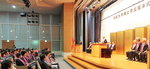 恭喜今天獲得博士學位的193名同學,當中包括38名女同學與72名留學生。京都大學授予博士學位的人數累計達40,364名。我與在座的副校長、研究所所長、學館長、學舍長以及全體教職員,由衷祝賀大家取得學位。