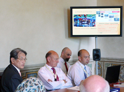 在瓦倫蒂諾城內Stanza della Caccia“探索(狩獵)大廳”的能源政策分科會上發言的松本紘校長(後面左起第一位),操作電腦的校長室室長小寺秀俊(後面右起第一位) |