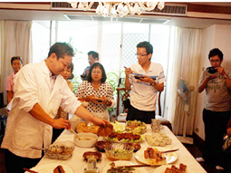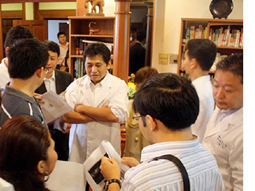 | 一邊聽取日本料理的說明,一邊就日本和泰國料理交換意見的參加者們 |