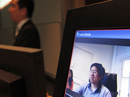 人在巴黎利用網路視訊參加會議的陳勇教授(右邊螢幕內)