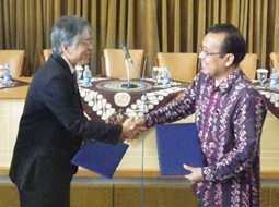 簽署協定書後握手的繩田副所長(左)與Pratikno校長(右) |