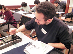 參加者們認真聽取老師的指導,為老師的精湛筆法傾倒。隨後參加者們以老師的字為範本努力練習,直到所有的練習紙用盡。最後,大家在畫仙板上寫下自己喜歡的詞句。完成後的作品都是極富個性的優秀作品。