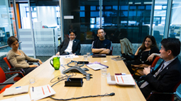 在「物質科學與微流體技術」組進行討論的iCeMS京都研究員王丹助教(前方右側)等人 |