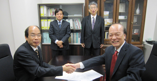 조인 후 악수를 나누는 트란 닥 수 학장(왼쪽)과 나리우 다쓰히코 경영관리연구부장(오른쪽)