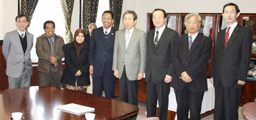 자이니 우장(Zaini Ujang) 말레이시아공과대학(이하 UTM) 부학장 일행(4명)이 교토대학을 방문했습니다. 요시카와 기요시 이사•부학장 외 모리 준이치 국제교류추진기구장, 쓰카모토 마사오 국제부장, 야오 다케시 에너지과학연구과장, 고바야시 신타로 지구환경학당장 및UTM과 본교의 학부, 연구과 또는 부국간 학술교류협정 코디네이터인 마쓰오카 유주루 공학연구과 교수가 일행을 맞았으며, 교토대학과 말레이시아공과대학의 교류에 대한 의견을 교환했습니다.
